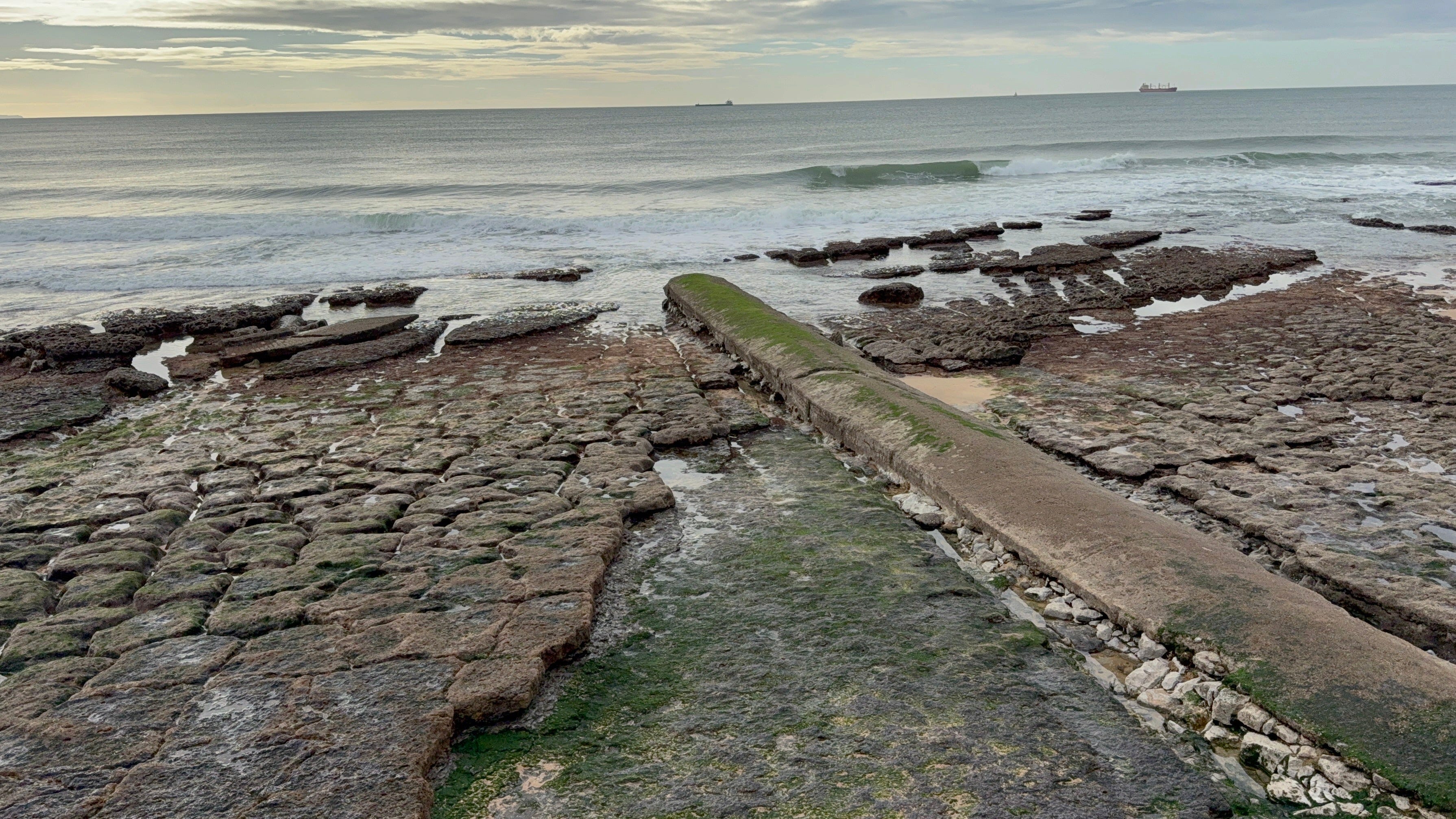 I walk to Homes Place gym daily and pass this stretch of coast in Estoril, and each time I slow without meaning to. The tide slides out and suddenly the beach is not really sand at all but a broad stone floor, patterned like an old courtyard, dark blocks fitted together as if someone laid them by hand. Then there is that narrow strip of concrete reaching toward the water, steady and plain, as if it has a job to do...