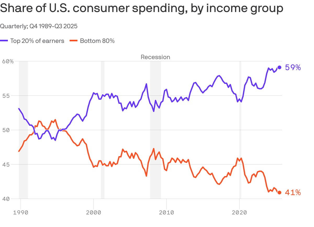 You are looking at a picture of a country that has quietly become two different economies sharing the same flag. Fifty nine percent of every dollar spent in this economy now comes from the top twenty percent of earners. That is not a typo and it is not a blip. It is a trend that has been building for a quarter century, accelerating through administrations of both parties, and it just hit a near record high. The bottom eighty percent of Americans, the vast majority of the country, now account for just forty one percent of consumer spending.